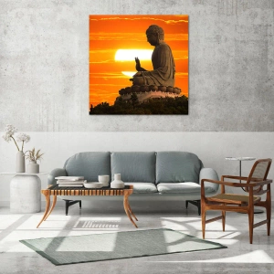 Quadro em vidro - Estátua de Buda com o pôr do sol como pano de fundo - 70x50cm - Sem medo do mundo - Decoração de parede moderna para a sala de estar e quarto ARTTOR