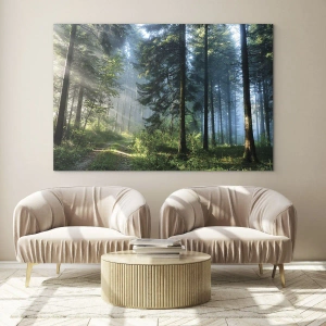 Quadro em vidro - Um caminho na floresta na névoa da manhã entre árvores altas - 70x50cm - Radiante de manhã - Decoração de parede moderna para a sala de estar e quarto ARTTOR