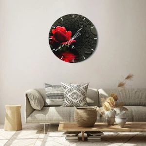 "Vermelho e Preto" é um elegante relógio de parede que encanta com a beleza da natureza e detalhes sutis. O mostrador redondo de vidro de 30x30 cm retrata uma rosa vermelha com gotas d'água, sobre um fundo escuro. O acabamento preciso e as cores expressivas fazem com que este motivo traga harmonia e estética única a qualquer interior.
