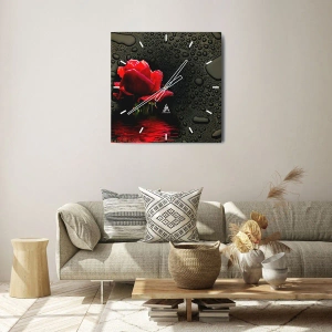 Relógio de parede - Relógio em vidro - Rosa vermelha com gotas de água em um fundo preto - 30x30cm - Vermelho e preto - Decoração de parede moderna para a sala de estar, cozinha e quarto ARTTOR