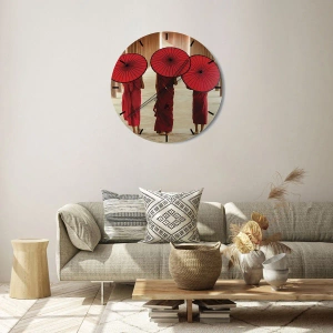 - Este relógio de parede redondo de 30x30 cm retrata três monges em vestes vermelhas segurando guarda-chuvas. Perfeito para interiores orientais ou modernos.