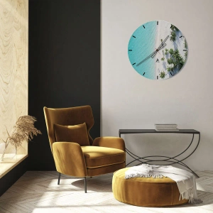 - Este relógio retrata uma vista de cima para baixo de uma praia exótica com águas azul-turquesa e palmeiras. Perfeito para os amantes de paisagens de férias, o formato redondo do relógio complementa uma variedade de interiores.