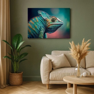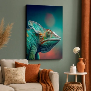 - Uma impressão em tela representando um camaleão em tons vibrantes de verde e laranja. Uma composição marcante e exótica, perfeita para interiores modernos.