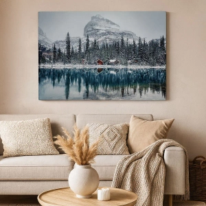 - Uma paisagem de inverno com cabanas na floresta com vista para um lago congelado. Uma decoração perfeita para trazer paz e beleza natural a qualquer interior.