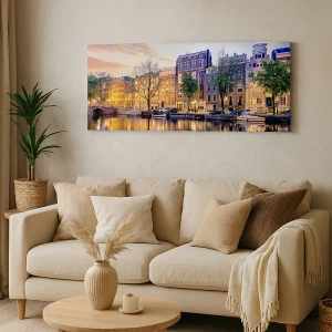Quadro em tela - Canal com reflexo de casas de cortiços na luz do entardecer - 70x50cm - Beleza holandesa contida e calma - Decoração de parede moderna para a sala de estar e quarto ARTTOR