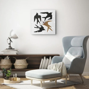 Relógio de parede - Relógio em vidro - Silhuetas pretas e douradas de andorinhas em um fundo branco - 30x30cm - Engula a diversão - Decoração de parede moderna para a sala de estar, cozinha e quarto ARTTOR