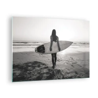 Quadro em vidro - Mulher com uma prancha de surfe na praia ao nascer do sol - 70x50cm - Filha da onda do mar - Decoração de parede moderna para a sala de estar e quarto ARTTOR