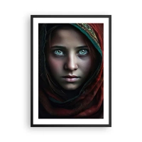 Pôster com moldura preta - Retrato de uma menina com um xale vermelho e olhos hipnotizantes - 50x70cm - Princesa oriental - Decoração de parede moderna para a sala de estar e quarto ARTTOR