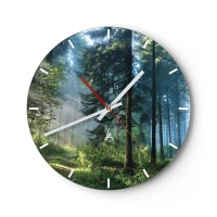 Relógio de parede - Relógio em vidro - Névoa matinal na floresta com raios de sol - 30x30cm - Radiante de manhã - Decoração de parede moderna para a sala de estar, cozinha e quarto ARTTOR