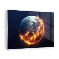 Quadro em vidro - Terra cercada por chamas no espaço sideral - 70x50cm - A chama do apocalipse - Decoração de parede moderna para a sala de estar e quarto ARTTOR