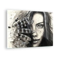 Quadro em vidro - Retrato de uma mulher com penas e detalhes abstratos - 70x50cm - Beleza selvagem - Decoração de parede moderna para a sala de estar e quarto ARTTOR