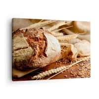 Quadro em vidro - Pão numa tábua com espigas de trigo e sacos de grãos - 70x50cm - Apetitoso, perfumado, crocante - Decoração de parede moderna para a sala de estar e quarto ARTTOR