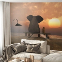 Papel de Parede Standard Eco - Um elefante e um cachorro em um banco admirando o pôr do sol sobre o mar. - 100x70cm - Como é bom ficarmos em silêncio juntos - Decoração de parede moderna para a sala de estar e quarto ARTTOR