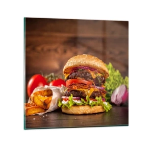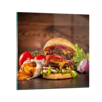 Relógio de parede - Relógio em vidro - Hambúrguer suculento com coberturas em um fundo de madeira - 30x30cm - Fruta proibida - Decoração de parede moderna para a sala de estar, cozinha e quarto ARTTOR