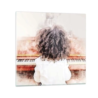 Relógio de parede - Relógio em vidro - Uma criança tocando piano, vista de trás em um estilo artístico. - 30x30cm - Num mundo novo - Decoração de parede moderna para a sala de estar, cozinha e quarto ARTTOR