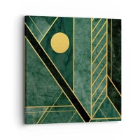 Relógio de parede - Relógio em vidro - Fundo verde com linhas geométricas douradas e um círculo dourado - 30x30cm - A dinâmica do ouro e do azul - Decoração de parede moderna para a sala de estar, cozinha e quarto ARTTOR