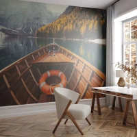 Papel de Parede Standard Eco - Vista de um barco de madeira de um lago cercado por montanhas e florestas - 100x70cm - Excursão na montanha - Decoração de parede moderna para a sala de estar e quarto ARTTOR