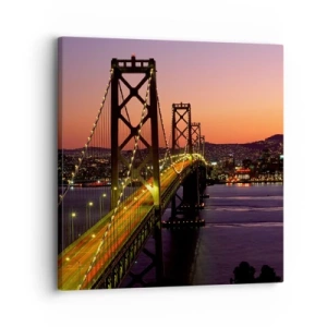 Relógio de parede - Relógio em vidro - Uma ponte iluminada por luzes durante o pôr do sol - 30x30cm - Noite em roxo - Decoração de parede moderna para a sala de estar, cozinha e quarto ARTTOR