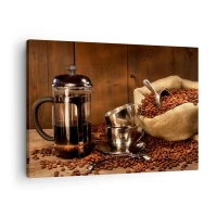 Quadro em tela - Prensa francesa, xícaras e um saco de café sobre um fundo de madeira - 70x50cm - O charme do café - aroma e sabor - Decoração de parede moderna para a sala de estar e quarto ARTTOR