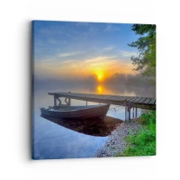 Relógio de parede - Relógio em vidro - Um barco no cais durante o nascer do sol sobre o lago - 30x30cm - Como o comum se transforma em mágico - Decoração de parede moderna para a sala de estar, cozinha e quarto ARTTOR