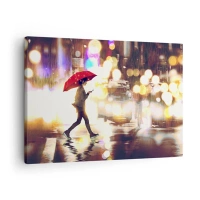 Quadro em tela - Uma figura com um guarda-chuva vermelho na rua na chuva - 70x50cm - Apesar de tudo, ensolarado - Decoração de parede moderna para a sala de estar e quarto ARTTOR