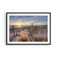 Quadro em tela - Praia do pôr do sol com cerca de madeira - 70x50cm - Brilho e sombra do vento - Decoração de parede moderna para a sala de estar e quarto ARTTOR