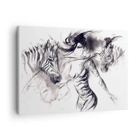 Quadro em tela - Uma mulher em uma dança dinâmica com zebras em uma estética em preto e branco - 70x50cm - Dançando com as zebras - Decoração de parede moderna para a sala de estar e quarto ARTTOR