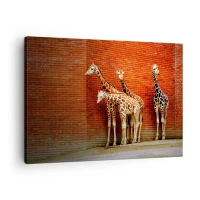 Quadro em tela - Quatro girafas contra uma parede de tijolos em um ambiente artístico - 70x50cm - Vê alguma acácia? - Decoração de parede moderna para a sala de estar e quarto ARTTOR