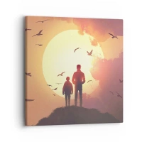 Quadro em vidro - Figuras de um pai e um filho em pé, tendo como pano de fundo o pôr do sol e pássaros voando - 70x50cm - Cara a cara com o sol - Decoração de parede moderna para a sala de estar e quarto ARTTOR
