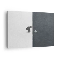 Quadro em tela - Figura de uma criança com um barquinho de papel contra um fundo de metades contrastantes - 70x50cm - Grande expedição - Decoração de parede moderna para a sala de estar e quarto ARTTOR