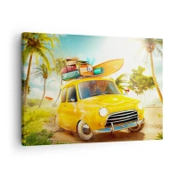 Quadro em tela - Um carro amarelo com bagagem contra uma paisagem tropical - 70x50cm - Uma viagem para mais do que um sorriso - Decoração de parede moderna para a sala de estar e quarto ARTTOR
