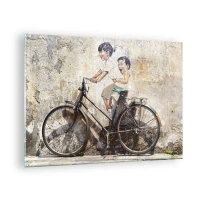Quadro em vidro - Um mural com uma bicicleta e figuras de crianças contra um fundo de parede. - 70x50cm - Verdadeiro ou falso? - Decoração de parede moderna para a sala de estar e quarto ARTTOR