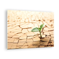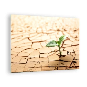 Quadro em vidro - Uma planta jovem crescendo em terra seca e rachada - 70x50cm - A força indomável da vida - Decoração de parede moderna para a sala de estar e quarto ARTTOR